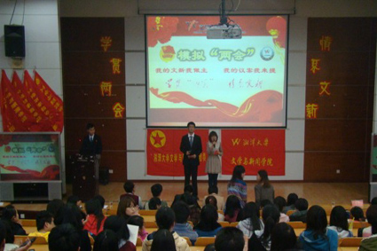 本次活动的主题为:“学贯两会,情系文新”,以“我的两会我做主,我的议案我来提”为口号。我院12级九个参赛班级分别从不同角度,为促进学校发展营造良好环境提出自己的建议。并配以精心制作的PPT,图文并茂地进行解说和阐释,此外,各班还在讲解过程中穿插了一些别致的小节目来增强台下观众的互鸣。整场活动精彩生动,于欢乐中传承两会精神,在细节中融入民生情怀。