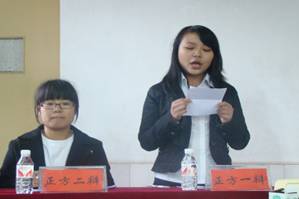 辩论队队长胡苾璇,副队长白月以及10级优秀辩手胡幸辉。本场辩论赛的正方是12广电2班,反方是12新闻1班,双方就“体育明星偶像化是否有利于体育的发展”这一辩题进行辩论。