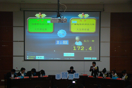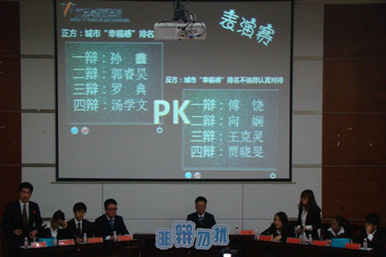 表演赛辩题为“城市幸福感排名值不值得认真对待”,来自我院辩论队的8位11级辩手依次登台,为大家呈现了一场精彩绝伦的比赛。正方所持观点为“城市幸福感排名值得认真对待”,开篇立论环节,正方一辩运用富有诗意的话语娓娓道来,并以全国典型城市为例,举出大量数据进行论证。反方一辩则从“调查机构不规范,调查方法不科学,调查样本不合理”三个破题论证“城市幸福感排名不值得认真对待”。在自由辩论环节,双方辩手唇枪舌剑,交替发言,将比赛推向高潮,双方在“幸福感”与“幸福感排名”的区别、调查数据的来源与科学性方面展开激烈辩论,惊人的语速、犀利的言辞使得现场掌声连连爆发。