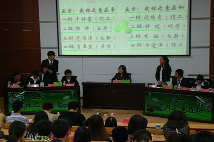 本次活动在我院辩论队的宣传视频中拉开帷幕。由我院辩论队成员制作的视频,幽默搞笑,却让大家看到了辩论队的温馨有爱。随后,主持人刘弈飞、刘丹青通过一段《爱情公寓》和《功夫熊猫》的视频,引出“武林之意在争”还是“武林之意在和”这一辩题。来自足球赛事直播