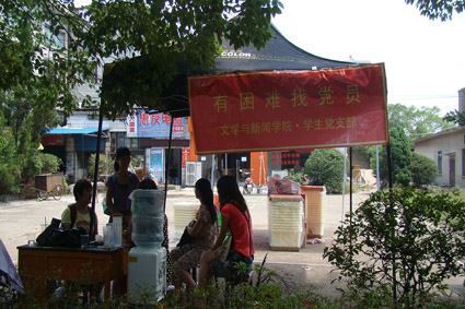 党员义务岗设有供水点,烈日炎炎,往来的新生、家长以及迎新工作者们都可以在此作短暂休息;同时,党员义务岗也是咨询站,工作人员可以为新生提供入学指导,解答新生疑惑;此外,党员义务岗是北苑的行李中转站,我院学生寝室分布在北苑、北青、中兴三个部分,党员义务岗为行李的搬运和中转提供了方便。