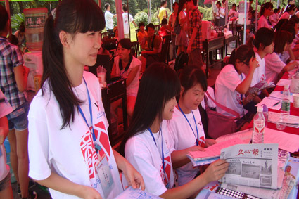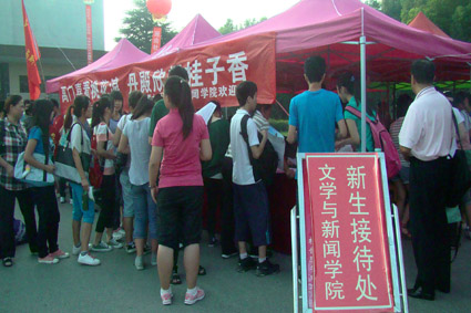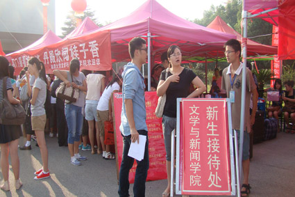 我院在俱乐部前坪的新生接待处可以说是实行24小时工作制,夜间,我院的男生轮番值班,主要是为了迎接一些夜间抵达学校的新生和家长,努力做到服务于每一位新生,不让任何一名新生感到为难。早上7点,我院迎新点的所有工作人员按时上岗,整个上午前来报道咨询的新生和家长不断,我院的迎新工作迎来高潮。