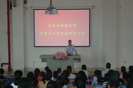 接着,党委书记李剑波教授发表讲话。李剑波教授分别介绍了我院汉语言文学专业、广告学专业、新闻学专业、广播电视新闻学专业的具体情况以及就业前景。李剑波教授还提到,大学的教学方式不同于中学,希望新生们可以尽快适应新的教学方式,培养独立学习的能力,利用好没有课的自由学习时间,提高自己的综合素质。