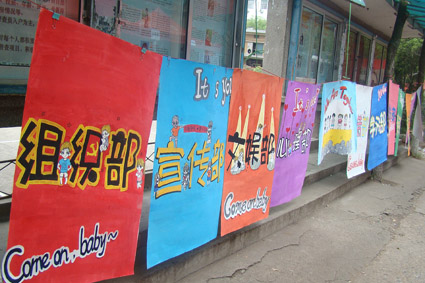 我院团委学生会有组织部、宣传部、青年志愿者实践部、文心报等14个部门,各部门职责不同、特点相异,可谓是各有千秋。北苑主干道上挂着由广告部手绘的14张海报,五颜六色的海报包容了每个部门的特色,吸引着往来的路人驻足欣赏。新生陆续到我院团委学生会招新摆点处咨询领表,团委学生会成员认真耐心地向前来咨询的新生介绍各部门情况。中午,北苑迎来人员流动的高峰期,到我院团委学生会摆点招新处咨询的新生人数也急剧增长。相对于9日而言,10日前来交表的同学居多,广大新生的表现积极、有礼貌,参与热情很高。