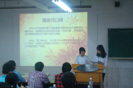 团委学生会青年志愿者实践部部长胡琰文进行了年度志愿服务总结,从1998年开始的在湘潭市青亭县青亭小学进行的“朝阳红“义务支教,在本学年共活动了15余次;“爱心护书”活动受到图书馆老师的高度评价,并且在今年,足球赛事直播
