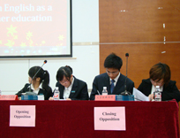 一队,二队分别为正方一二辩,反方三四辩,又成对打之势。双方辩手口语流利。举止风度十足,论点条理清晰,掷地有声。