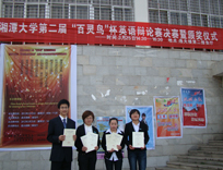 3月25日下午2:30,湘潭大学第二届’“百灵鸟”杯英语辩论赛暨十六届“外研社”杯全国辩论赛校园选拔赛总决赛在逸夫楼第二报告厅精彩上演。我院一队,二队,商院四队,物理院队进行了一场精彩的英语博弈。最终,我院获得优秀组织奖,一队邹雨柔、陈雅荣获冠军,二队沈照宇、高点点获一等奖,邹雨柔、高点点两位选手获得“最佳辩手”称号。