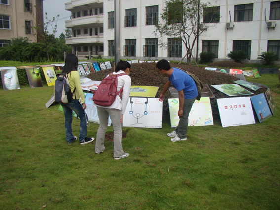 此次广告作品展于9月6日在第三教学楼前草坪上开展,展出的广告创意包括衣、食、住、行、用各个方面,一幅幅精美的图片,一个个精彩的创意,在观众们的面前展现了一场美轮美奂的广告盛宴。