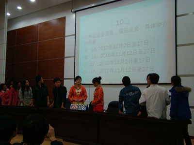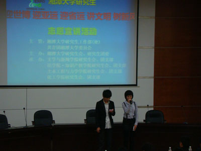 3月29日晚上,“迎世博 迎亚运 迎省运 讲文明 树新风”湘潭大学研究生志愿宣讲活动在逸夫楼报告二厅成功举行。宣讲活动形式生动活泼,内容非富多彩,既包含了大量的文明礼仪知识,又展现了世博、亚运、省运的精神内涵。
