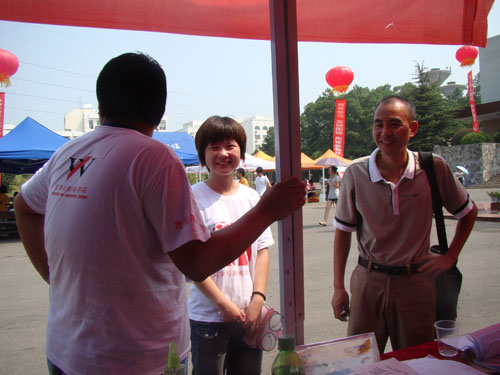 唐书记一个人走向我们的接待点,正好在前台询问报到情况的团委学生会主席涛哥和第二团副谢雯姐,及时向唐书记做详细介绍,至此时我院317 名新生仅剩21位尚未来校报名。除此之外,唐书记还问到今年的我足球赛事直播