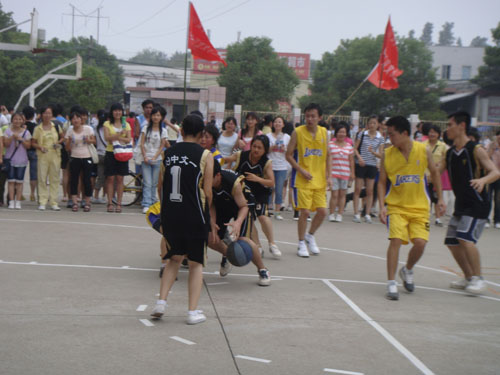 9月19日上午10点整,北青篮球场,在09中文一班和09新闻二班双方啦啦队热烈的呐喊声中,比赛正式拉开帷幕。哨声一响,中文一班首先占得机,抓住对方的防守漏洞,先下一成,取得了比分的领先。而新闻二班也毫不示弱,防守进攻尽显冲劲,但由于男女配合稍欠默契,导致比分一直落后。第一节结束,中文班以20:6暂时领先。