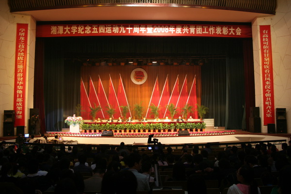 4月28日晚上,湘潭大学、湖南科技大学、湖南工程学院的校领导、教职工、学生代表齐聚湘潭大学俱乐部,湘潭大学2008年度共青团工作表彰大会暨湘潭市高校纪念“五四”运动90周年青春华章文艺晚会在此隆重举行。校领导党委书记肖国安,党委副书记李伯超,副校长黄云清、戴飞军、陈小明、周益春、王继平,校长助理高协平、张海良以及相关领导出席了本次表彰大会。