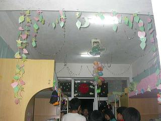 中兴的四人寝室普遍给了我们一种宽敞融洽的感觉,各有各的风格。充满书香气息的516在墙上书写了“书山有路勤为径,学海无涯苦作舟”几个大字,以督促自己学习。广电一班614“我们的窝”在屋顶装饰了许多彩色的纸制百合花,主题命名:芳草年华。631是最后一个寝室,也是最让人惊奇的寝室。门口挂着自制的星形吊坠,上面有08中文二班所有同学和他们辅导员的照片,进入室内是一室的粉红气息,用粉色褶皱纸包裹的灯管,用粉色气球装点的屋顶和屋门,每一个气球上都有同学们的祝福。最令人欣喜的是,四个人的书桌墙上都有属于自己的愿望与心情:“青春在这里激荡,梦想在这里起航,眺望远方,我们从这里成长。”“我们走着,为梦想而追逐、闯荡,我们知道我并不孤单,我和我的朋友一起成长。”地上更是别具一格的贴了许多脚掌印,象征着她们成长的足迹。手工制的花篮与花是她们情谊与才艺的体现,这里是她们梦想的国度!
