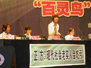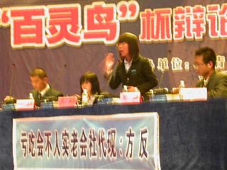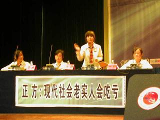 在整个辩论过程中,双方辩手唇枪舌战,进行了激烈的辩论。经过一辩的立论陈词,双方辩手充分阐释了自己的观点,条列了自己的立论根据。第二环节精彩激烈的对辩,使双方观点进一步明晰。经过第三小节的相两轮盘问,双方互不示弱,紧抓自己的理论的同时,攻击对方的漏洞。在盘问小结后的自由辩论时,他们围绕着老实人诚信的特点和现代社会的复杂而展开。正方用农民工讨不到工资而只有自杀,消费者购买到假冒伪劣产品而生命受到威胁来证明现代社会老实人会吃亏,而且吃亏后也的不到回报。而反方则以文花枝是老实人而且没有吃亏来进行反驳。一句句精辟的分析,一个个精彩的段子,为整场辩论赛赢得了一阵又一阵的掌声。最后,整场辩论赛在正方四辩“提倡每个人讲诚信,老实人才不会吃亏”的号召声中结束。
