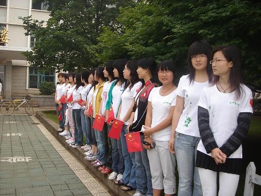 06级广播电视新闻一班统一着班服的同学,他们手中挥舞着小国旗,左臂上贴着心型国旗徽标。在06广电一班的带动下,07级广电一班的同学也加入到升旗仪式的队伍中来。6点在三教门前集合,赶到一教门前,同学们的热情可见一斑。