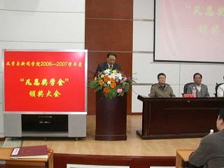 我院李剑波书记主持会议,在他宣读获奖名单后,五位获奖同学上台领奖。04级新闻学2班李纯、04级广播电视新闻学2班贾肖虎、05级新闻学2班米艳军、05级汉语言文学2班蓝敏国和06级广告学1班朱利平获得了本次“凡恩奖学金”。蓝敏国代表获奖同学发表获奖感言,抒发了深深的感恩之情。