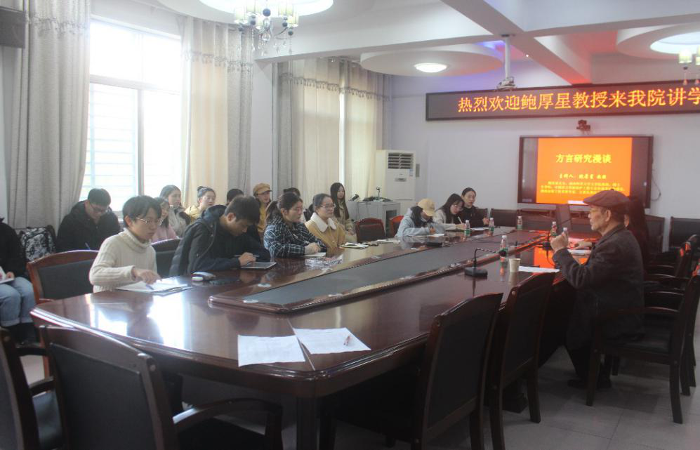 (通讯员 陈虹 全艳琳 摄影 朱克克)12月6日下午14:30,中国语言资源保护工程专家咨询委员会委员,湖南语保工程首席专家,湖南师范大学文学院教授、博士生导师鲍厚星莅临我院第三教学楼317会议室,为我院师生作题为《方言研究漫谈》的学术讲座。此次讲座由陈山青教授主持,我院唐智燕教授及全体语言学、文字学专业研究生现场聆听。