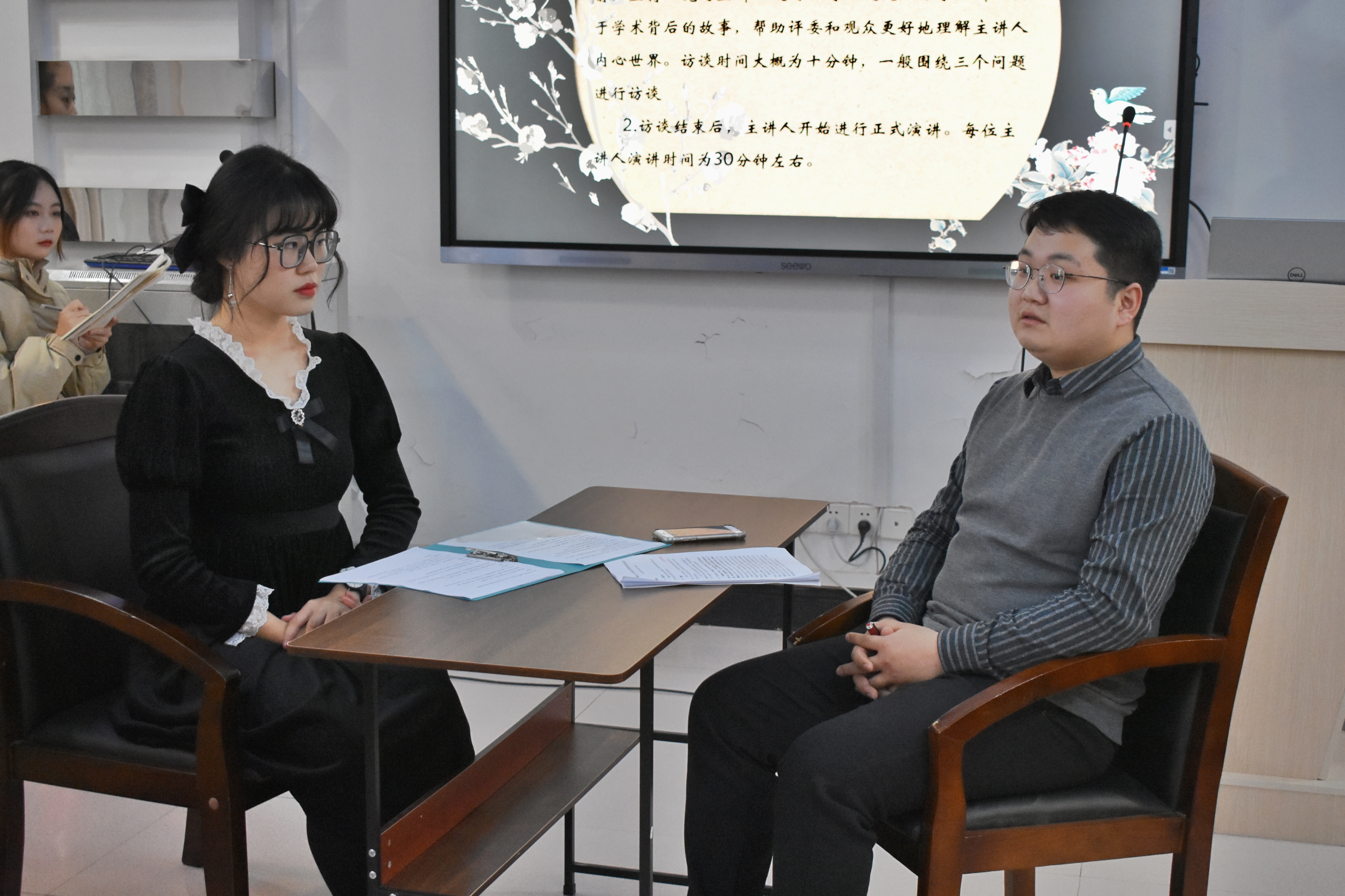 赵猛书记致辞后,主持人介绍论坛形式。不同于传统的“一对多”的论坛形式,此次论坛独具创新地采用“访谈+演讲”相结合的形式,将场地布置为一对一“访谈现场”,将观众席安排成对桌而坐的形式。主持人与嘉宾面对面进行问答形式的访谈,拉进了观众与嘉宾的距离。同时我院还提供给每位观众活动资料袋和纪念礼物(书签),帮助观众提前了解“湘韵”论坛和主讲内容,真正发挥“湘韵”论坛促进交流的作用,新颖的形式为分享会营造了活跃轻松的氛围。
