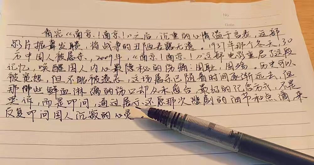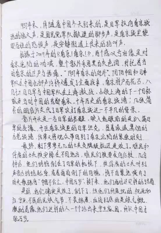 “是的,他们确实失败了,倒下了,但他们所展现的视死如归、宁死不屈的民族气节,不畏强暴、血战到底的英雄气概,激励着像他们这样的人一个个站出来守卫家园,所以中国才能万岁。”这是一位同学的观影感。电影作为当代青年喜闻乐见的一种媒介形式,在公祭日前夕,主题教育活动安排通过以海报的形式,呼吁同学们观看电影《南京,南京》,师生通过影片更加直观地感受到南京大屠杀给我国人民造成的深重灾难。