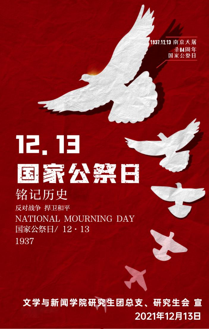 研究生团总支在微信公众号、QQ空间等地发布“国家公祭日”悼念推文,并向大家推荐南京大屠杀相关书籍,如《守望历史——四十年来南京大屠杀记忆传承口述》、《南京大屠杀史实展》、《紫金山的碉堡》等,呼吁大家对其进一步了解“南京大屠杀”这段历史事实,并鼓励大家求是自强,为祖国的繁荣昌盛而努力。