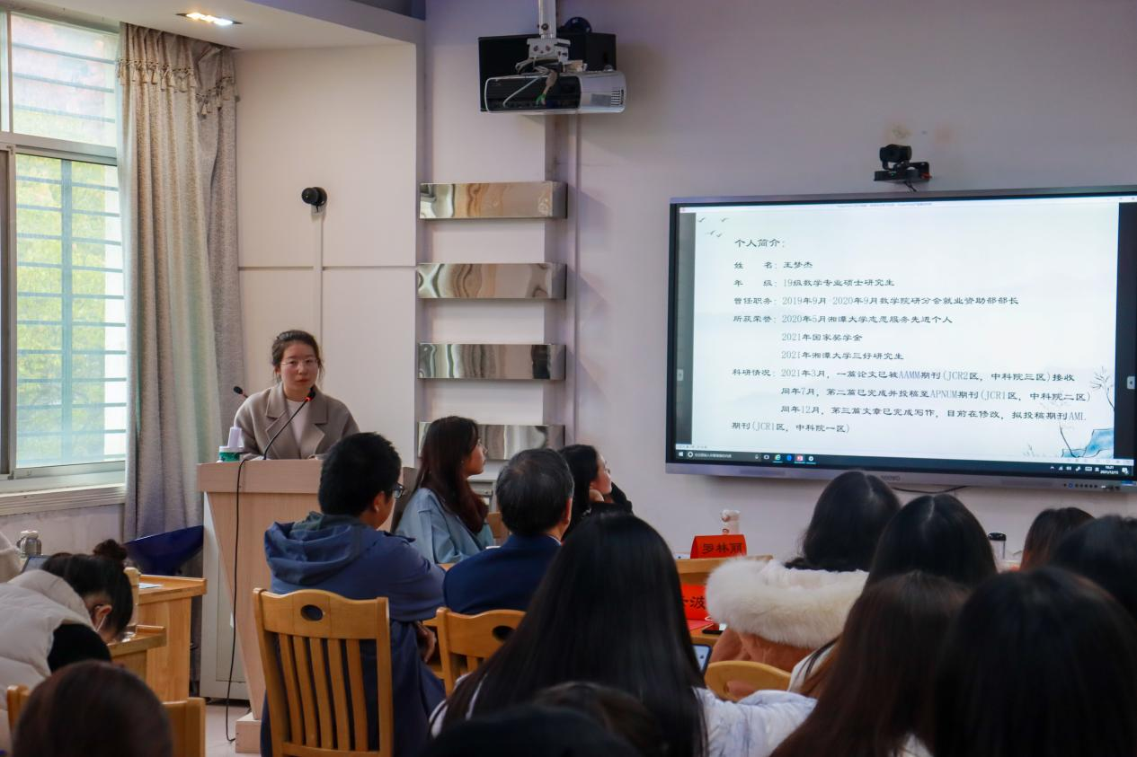 最后由数学与计算科学学院硕士研究生王梦杰带来科研论文学术交流。王梦杰的演讲主要围绕两大方面展开:一是理工科科研,二是科研论文的共性。她分享了理工科科研生活、内容以及自己的科研经历,认为人文素养对于理工科学生做科研的影响在于从某个高度帮助理解科学的浪漫和精妙。演讲结束前,她介绍了继续深造的四种考核方式,为想要继续深造的同学提供路径信息。