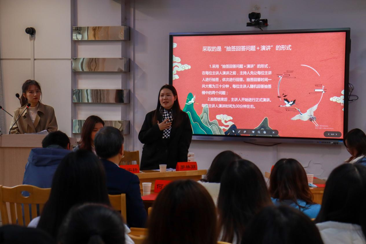比较文学与世界文学专业2019级博士研究生刘金、文艺学专业2020级硕士研究生邝宇轩、新闻传播学专业2020级硕士研究生罗林丽和数学与计算科学学院数学专业2019级硕士研究生王梦杰为大家带来了一场精彩纷呈的学术分享。本次论坛采取的是“抽签回答问题+演讲”的形式,由2021级语言学专业研究生熊冰柔主持,足球赛事直播