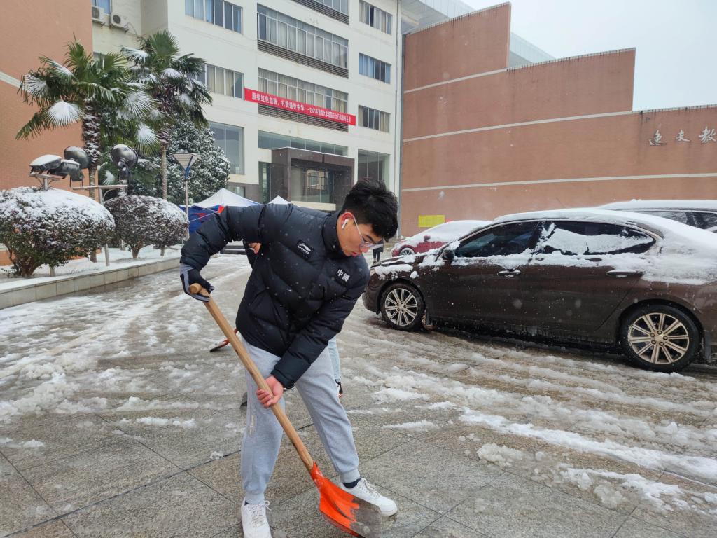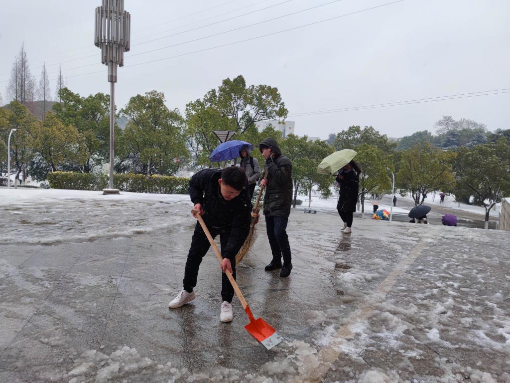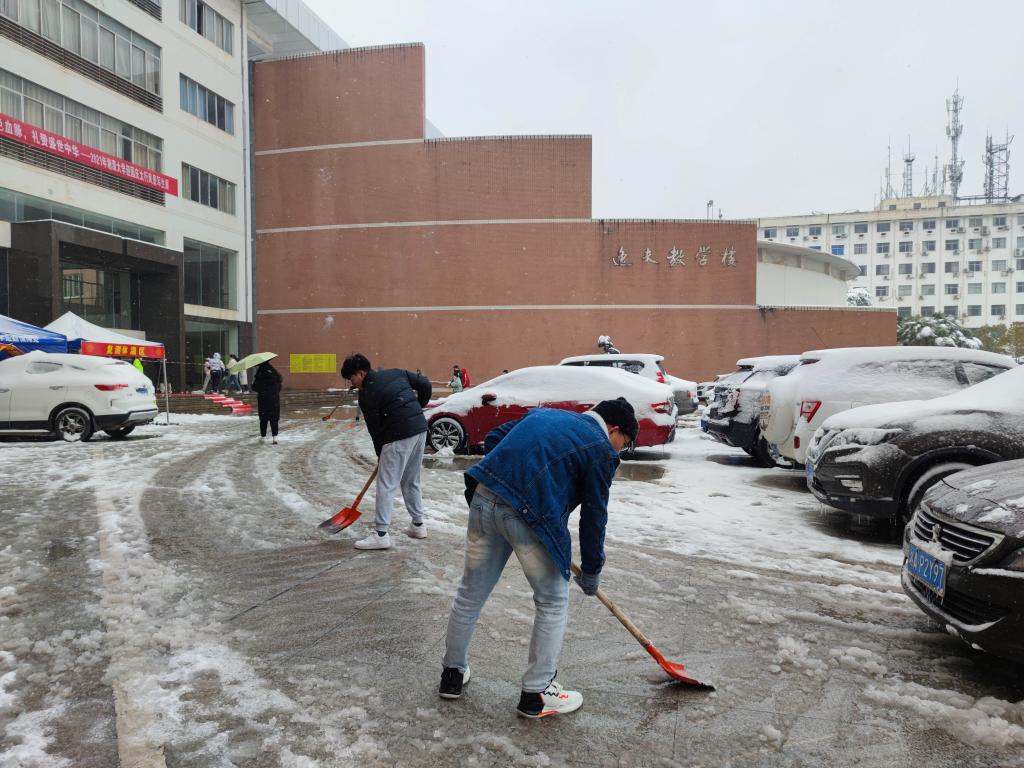 组织部分研究生党员、研究生学生干部志愿除雪,为我校考研学子保驾护航。