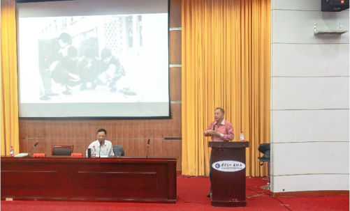 在季水河教授缓缓介绍校友张效雄中,拉开了本次讲座的序幕。演讲伊始,张效雄自我介绍道“我是一个记者出身的作家。”追忆往昔峥嵘岁月,张效雄用7张照片生动的讲述了回望1977级时,湘大的7个“最”。最“委屈”,被“骗”到湘潭大学、最高产的黄土高坡、最“难堪”的重点大学、最有特色的校园、最“奇葩”的图书馆、最伟大的老师、最“牛皮”的同学。这7个“最”生动地再现了湘大走过的奋斗之路,展示了奋斗路上的湘大人,每一个“最”都浓缩着湘大沉甸甸的校史。