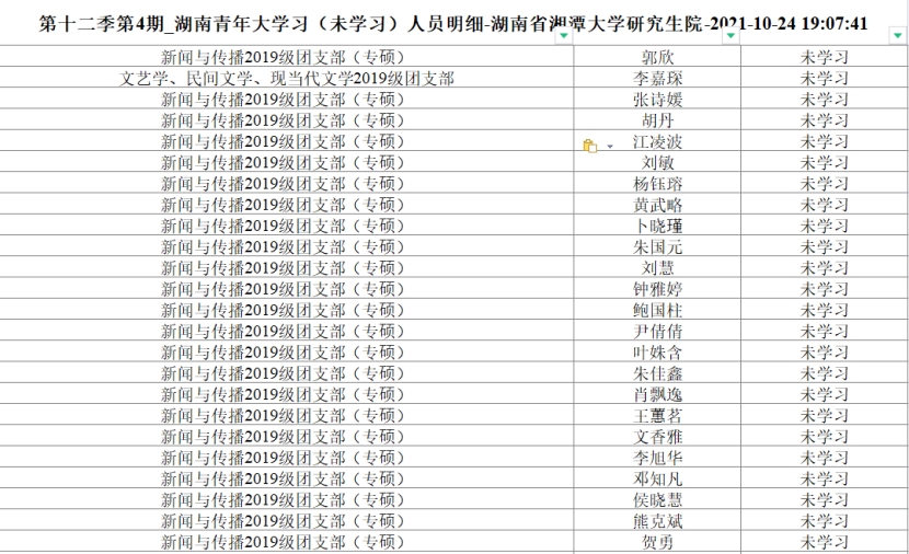 青年大学习第十二季第4期学习已截止,截止时间为10月24日晚七点。现将未学习名单公布如下。请各团支部书记今后务必认真督促团支部成员,落实每周青年大学习的完成。