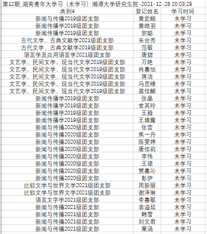 青年大学习第十二季第12期学习已截止,截止时间为12月26日晚七点。现将未学习名单公布如下。请各团支部书记今后务必认真督促团支部成员,落实每周青年大学习的完成。
