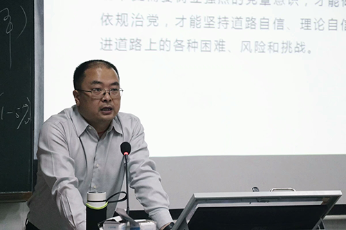 接下来,由公共管理学院党委副书记谷立平老师作专题讲座。此次讲座以“学好新党章,学透十九大,践行社会主义核心价值观,在新时代新征程中接受检验”为主题。讲座内容共分为三大部分,一是学好新党章,二是学透十九大,三是践行社会主义核心价值观。首先,和蔼可亲的谷立平老师为大家讲解了学好新党章的重要性,介绍了党章的功能和地位,党章的修改历史,党章的基本框架及主要内容,并积极鼓励同学们树立党章意识。他强调,树立党章意识,是我们党不断取得胜利的重要法宝,是强化党的观念的现实需要,更是全面从严治党的应有之义。随后,谷立平老师从中国共产党第十九次全国人民代表大会开始讲起,讲述了十九大完成的重要工作和同学们应该树立的对十九大的总体认识。他指出,十九大报告是科学的理论指导和行动指南,是决胜全面建成小康社会和实现中华民族伟大复兴中国梦的进军号角,并介绍了十九大报告中的部分重要内容,详细阐述了习近平新时代中国特色社会主义思想。最后,谷立平老师从是什么,为什么,和怎么样三个方面介绍了践行社会主义核心价值观的重要内容,并呼吁同学们从自身做起,用实际行动向党员看齐。整场讲座内容充实,讲解细致,不仅进一步加深了同学们对中国共产党的理解,还使同学们备受鼓舞,奋发向前,为成为新一代中国共产主义接班人而努力。