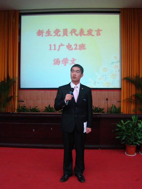 访谈之后,主办方播放了811级新生党员军训时的DV短片。其中,新生党员纷纷表示在今后的学习和生活中,将牢记自己的党员身份,肩负党员义务与责任,保持先进性,争做一名优秀党员。在11级广播电视新闻学2班的汤学文代表新生党员上台发言后,新生党员一一上台亮相,廖文婷老师与肖小亮老师为其佩戴党徽,全体与会人员共同见证这一庄严神圣的时刻。