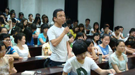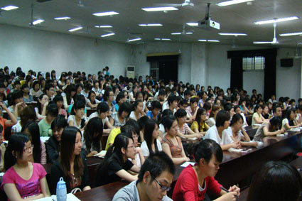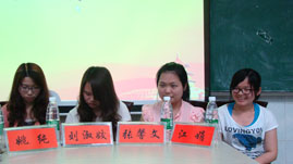 交流会开始,四位学姐首先进行简单自我介绍,08级汉语言文学三班姚纯学姐报考的是武汉大学文艺学08级新闻学一班刘淑姣学姐报考的是武汉大学传播学08级广播电视新闻学一班张馨文保研四川大学新闻与传播学;08级广告学二班江娟报考的是厦门大学传播学。接着四位学姐还分别用一个词概括自己的考研感受,意料之中、意外淡定、平静和难以置信,这四个词勾起了学姐们对自己考研经历的记忆。