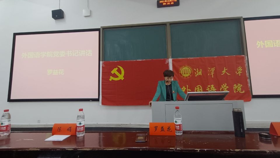党委副书记周鹏飞,外国语学院党委书记罗益花,外国语学院党委副书记陈娟,公共管理学院党委副书记李伶俐,组织员吴梦云老师,刘非老师,陈继丽老师出席此次会议,2021年第四期发展对象培训班的同学与会。