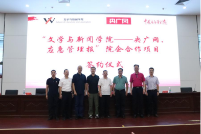 为了提高学生实践能力、就业能力和创新能力,完善人才培养机制,推进毕业生就业工作。9月11日上午,我院与央广网、中国应急管理报两家单位在研究生院报告厅举行了校企合作签约仪式。校党委副书记廖永安教授与中国应急管理报内参部主任、央广网南方应急融媒报道中心主任黄雄、央广网湖南频道副总编辑张志诚共同签署了校企合作协议。院长雷磊教授、央广网文化传媒有限公司湖南分公司工作负责人林得雨、校教务处副处长杨伟、杰出校友程兴国先生、学院相关负责人及全体新生等600余人共同见证了签约仪式。