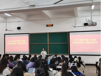 为进一步提升学生的综合实践能力,增强学生职业意识,4月25日下午,我院在逸夫楼四阶教室召开2020级考研、实习动员会。院党委副书记周鹏飞、副院长刘晓丽、各系系主任、实习带队教师、全体2020级本科生参会参会。会议由中文系副主任彭慧主持。