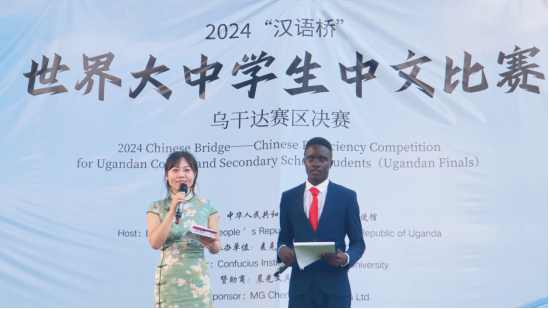 当地时间6月2日下午,由中国驻乌干达大使馆主办、麦克雷雷大学孔子学院承办的2024“汉语桥”世界大中学生中文比赛乌干达赛区决赛在乌干达首都坎帕拉羌博戈中学成功举行,吸引了1000余人参与。我院田华教授担任此次比赛的评委组组长,袁娜博士担任中英双语主持人。本次比赛共评选出大、中学生组一等奖各1人、二等奖各2人、三等奖各3人。钟磊、李秀两位同学分获大学生组和中学生组的一等奖,待中国驻乌干达使馆审核通过后,他们将获得于今年下半年代表乌干达前往中国参加全球总决赛的资格。