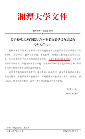 根据《关于开展2023年湘潭大学本科教育教学优秀基层教学组织评选工作的通知》,经各学院(教学部)申报、专家评审等考评环节,我院新闻系获评2023年湘潭大学本科教育教学优秀基层教学组织。