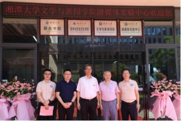 院长雷磊共同为实验中心揭牌。浙江传媒学院电视编辑与导播国家级实验教学示范中心副主任胡一梁、中南大学人文学院院长范明献、长沙理工大学文学与新闻传播学院院长刘建新、湖南理工学院文学与传播学院院长王文锋、湖南城市学院人文学院院长傅建安、湖南女子学院文学与传播学院院长刘琼、湖南科技大学文学与历史文化学院执行院长李康澄、湖南大学新闻与传播学院副院长谢莹、湖南师范大学新闻与传播学院副院长李琦、湖南省广告协会会长曾小明、人民日报传媒广告有限公司湖南分公司总经理张志强、湖南日报社文体频道总监曹辉、湖南广播影视集团足球赛事直播副总监高金华、芒果超媒副总编辑易柯明、湖南经视副总监田杰、湖南都市副总监余波、湖南教育电视台副总监资喻宇、湘潭日报社副总编龙卫国、中科大洋教育事业部总监魏哲、湘潭广播电视台新媒体中心主任曾伯秋、湘潭大学职能部门负责人杨澜、胡强、杨建军、杨端光、孙明辉、王威燕及学院师生代表出席揭牌仪式。挂牌仪式由足球赛事直播