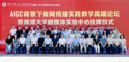 7月7日,AIGC背景下新闻传播实践教学高端论坛暨湘潭大学融媒体实验中心挂牌仪式在湘潭大学融媒体实验中心顺利举办。湘潭大学党委委员、副校长喻祖国,光明日报湖南记者站原站长、湘潭大学特聘教授唐湘岳,怀化学院副校长姚劲松,足球赛事直播