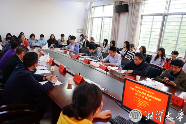 党委副书记周鹏飞等人立足自身工作实际,阐述了对于做好青年工作的认识。申永丰结合习近平总书记在校庆60周年前夕对我校做出的重要批示,阐释了湘大精神的内涵,鼓励青年学生奋斗要实、奋斗要勤、奋斗要久、奋斗要新。吴彬彬结合团学工作的经历,鼓励学生们既要仰望星空,也要脚踏实地,从日常小事做起,践行爱国情怀。周鹏飞要求大学生正确处理好“小我和大我、目标与行动、单干与协作、书本与实践、传承与创新”六大关系,让大学生活更出彩。