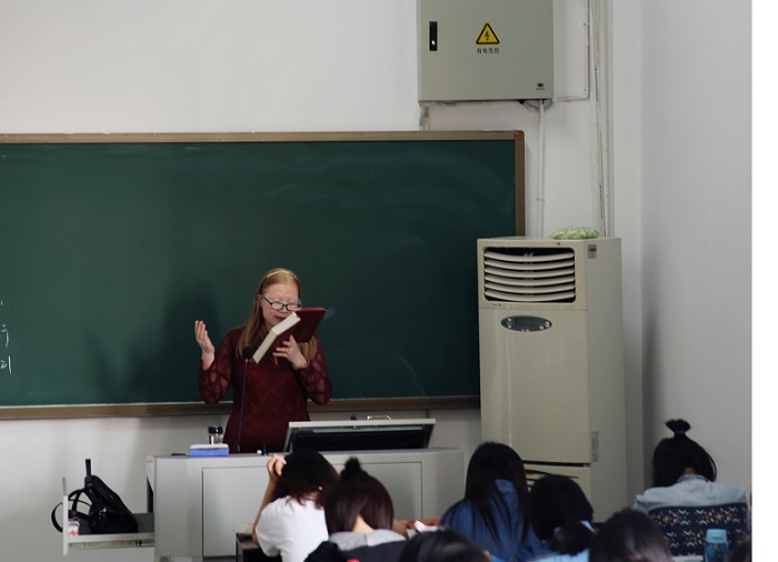 沈云霞老师则以“旧约文学内容”为主题,首先对《圣经》的神话传说种类进行概述,接着对《圣经》中的一则著名的创世神话上帝造物,予以细致地解读,用诗一般的语言娓娓道来,并联系中国古代盘古开天的故事进行比较,丰富和拓展了学生们的视野。在实际的教学过程中,沈老师还采用双语教学模式,引导学生学习《圣经》英文原典。两位老师从不同角度和不同的方式,展示了自己深厚教学功底,取得了良好的教学效果。听课的学生及参加观摩的教师均受益非浅。