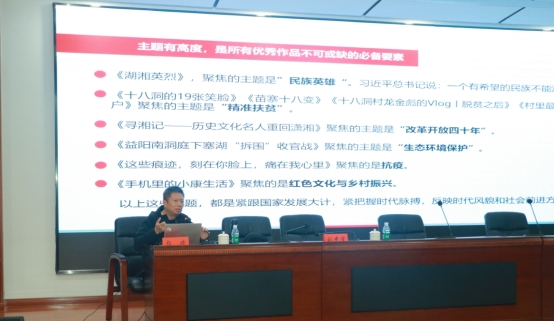 “中国新闻奖的‘中’是守正创新的中国立场,‘国’是家国情怀的宏大叙事,‘新’是技术赋能的表达革新,‘闻’是深入基层的敏锐嗅觉。”颜斌副总编辑结合时代热点与习近平总书记的相关讲话、党中央的相关指示,从“主题要有高度”“切入要有深度”“形式要有锐度”“刊发要有速度”“传播要有广度”“申报要有准度”等六个方面展开,并通过展示《湖湘英烈》《十八洞的19张微笑》《村里最远那一户》《今年我10岁》《手机里的小康社会》《十八洞村龙金彪的VLOG丨脱贫之后》《留学中国》《苗寨十八变》《益阳南洞庭下塞湖拆围收官战》等获奖作品,向在场师生详细解码了“7年12奖”的成功秘籍。