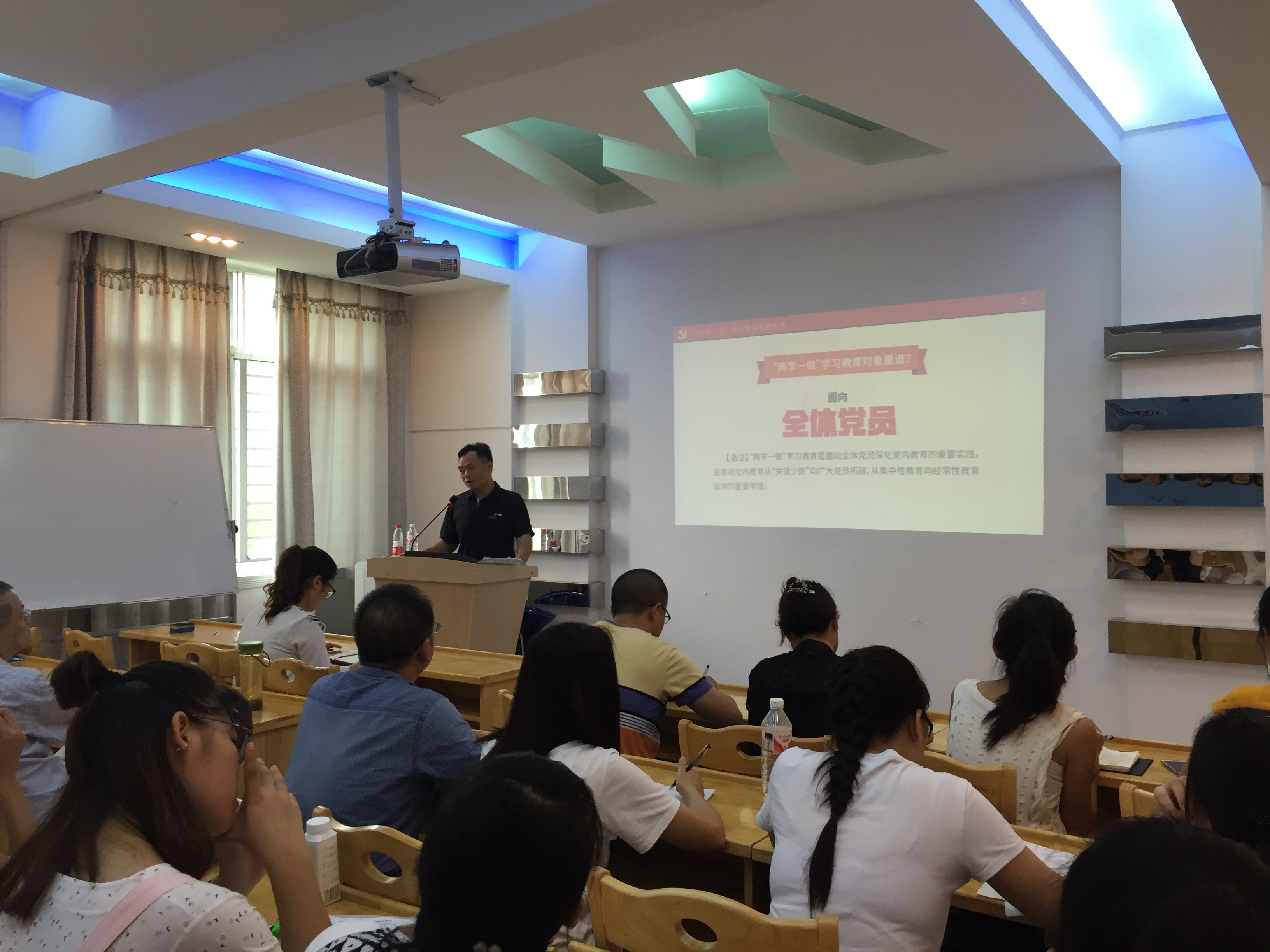 党课开始后,王书记先简要介绍了“两学一做”为什么、学什么、做什么、怎么学、怎么做等内容。然后从总体上带领大家把握习近平总书记系列重要讲话的精神,随后着重强调了习近平总书记关于新闻宣传、新闻舆论讲话的主要观点,同时结合足球赛事直播