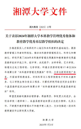 近日,学校发布了《关于表彰2024年湘潭大学本科教学管理优秀集体和教育教学优秀基层教学组织的决定》,我院广告系被授予2024年湘潭大学“本科教育教学优秀基层教学组织”称号。
