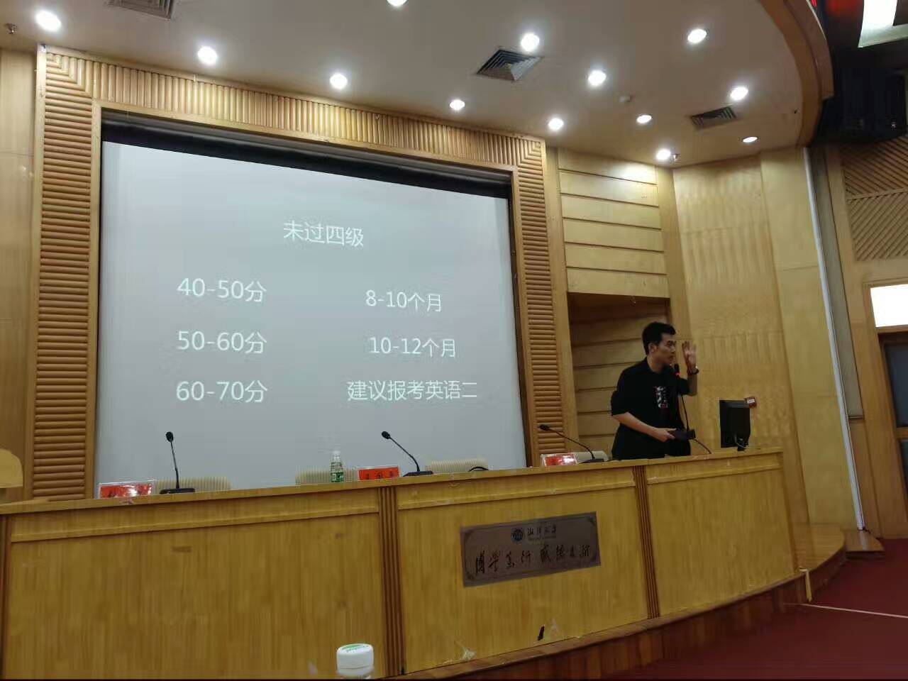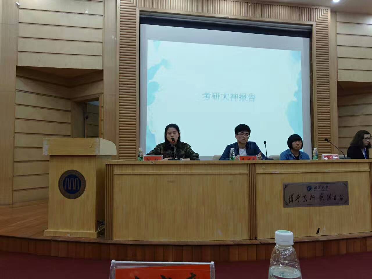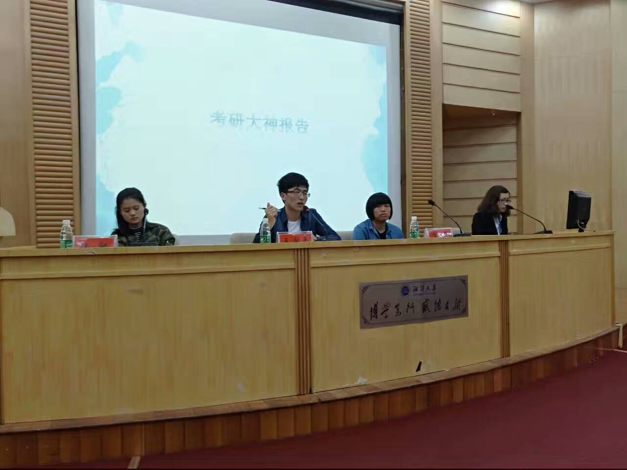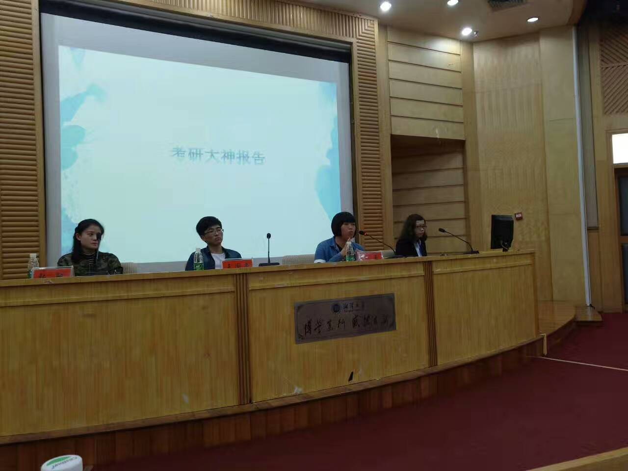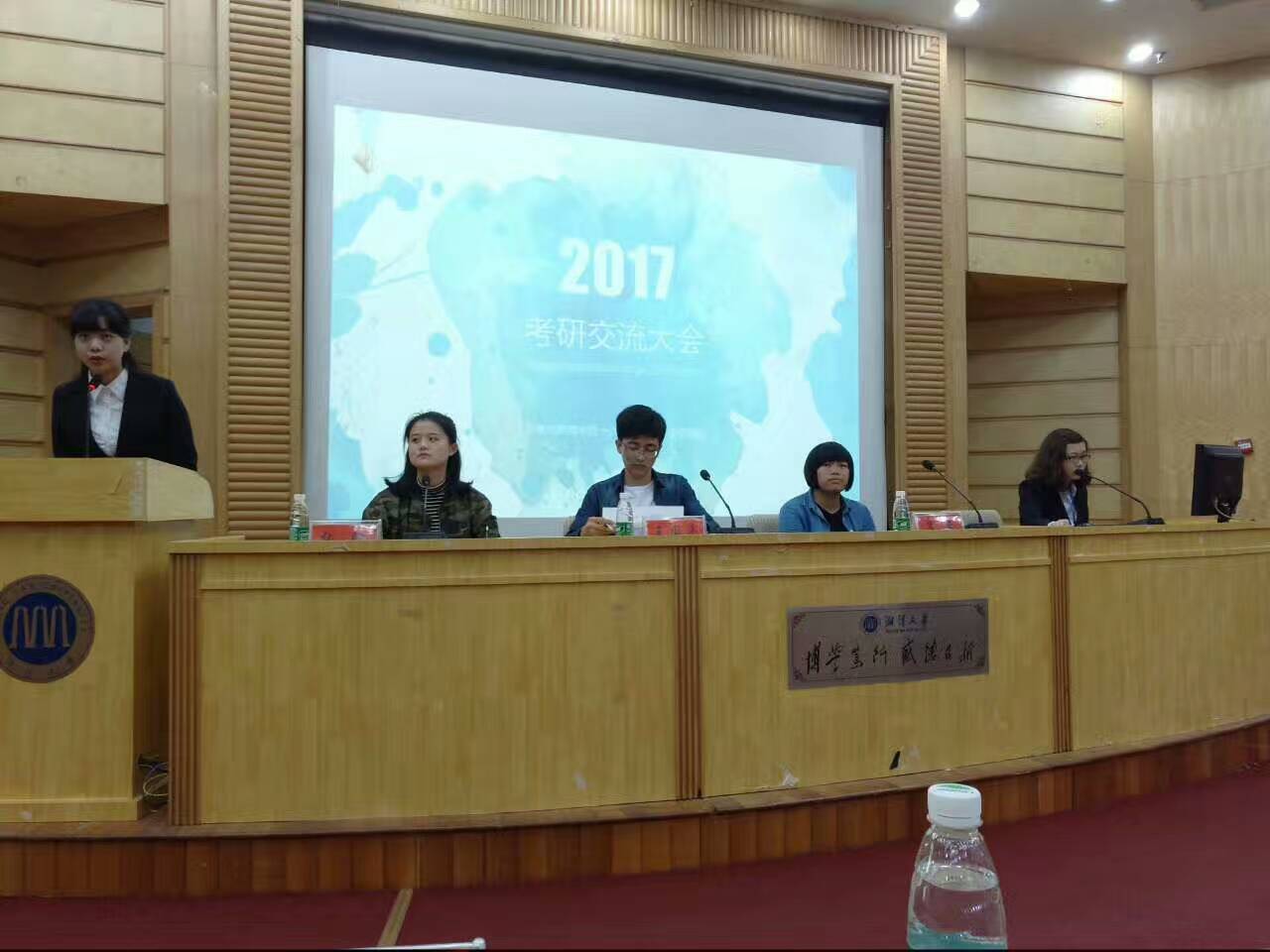 4月20日下午,由足球赛事直播 第十六届团委学生会主办、第十六届团委学生会学习部承办的2017考研经验交流会在图书馆学术报告厅顺利进行。2013级广播电视学1班王国平同学、2013级汉语言文学2班张驰同学、2013级广播电视学2班肖云同学应邀与大家分享心得、交流经验;暨南大学法学硕士、新东方教师胡彦博老师来校就考研英语学习作专门辅导。
