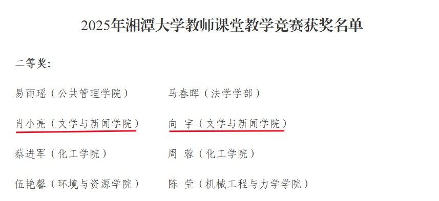 近日,2025年湘潭大学教师课堂教学竞赛圆满结束,我院肖小亮、向宇两位老师凭借扎实专业功底与优质课堂设计荣获二等奖,尽显我院教师优良教学风貌。