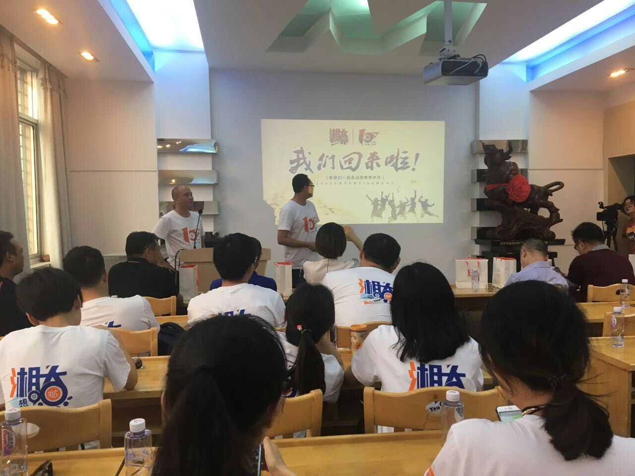 主题班会后,2003级广告班校友向学院捐赠了名为《牛势》的工艺品,并衷心祝愿母校湘潭大学的发展更加牛气冲天,衷心祝愿母院的一级学科博士点申报等各项工作势在必得。