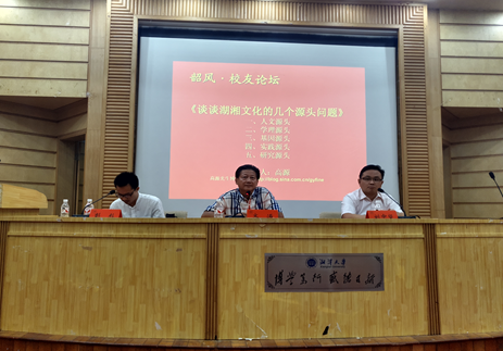 简单而隆重的颁奖典礼后,高源先生作了题为《湖湘文化的几个源头问题》的讲座。他从人文源头、学理源头、基因源头、实践源头和研究源头等五个方面,论述了由古至今湖湘文化的发展历程。在人文源头方面,他从屈原、贾谊讲起,表明“忧国忧民”便是湖湘文化的内核,也正是因为具有这种精神内核,才使得湖湘文化绵延不绝,世代相传;学理源头方面,高源先生则通过南宋胡安国、胡宏父子潜心治学、创立湖湘学派的历程,突出其在湖湘文化中的重要地位,进而表明“经世致用”对湖湘文化的影响;在基因源头方面,高先生从“湘菜”、移民等方面讲起,“湘菜的兴起,为湖湘文化的大力发展创造了良好的条件”,“移民则为湖湘文化注入了更多的吃苦耐劳和积极开拓等精神”;实践源头中,高先生则从经世派、洋务派、维新派、革命派和无产阶级革命派的历史发展情况,讲述了湖湘文化的历史延续与发展;而在研究源头方面,高源先生则为我们介绍了湖湘文化的集大成者——林增平先生。高源先生旁征博引、深入浅出的讲述,不时赢得台下听众的阵阵掌声。