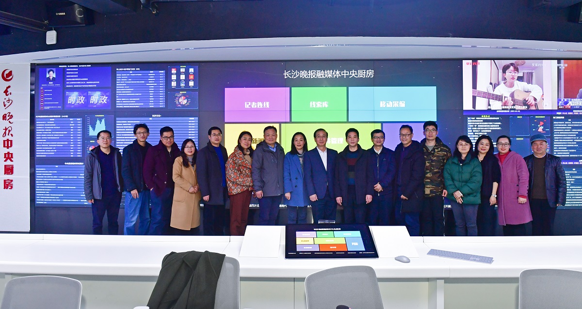 随后,调研团队又赴《长沙晚报》报社进行了考察观摩,并与业内专家进行了座谈。《长沙晚报》党委书记、社长、总编辑李鹏飞、长沙晚报传媒集团有限公司副总经理周艺、报社党委办公室主任舒薇等相关领导及业内专家出席了与调研团队的座谈会。诸位领导及专家介绍了《长沙晚报》的发展历程及产品、技术积累,特别是融媒体建设方面的成功经验,逐一解答了调研团队的相关问题。在未来的学生培养方面,专家组指出,未来应着重培养学生三种思维模式:全媒体思维、技术思维与商业思维。